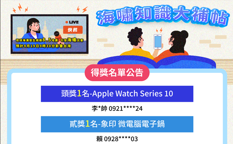 海嘯知識大補帖中獎名單出爐囉!恭喜各位中獎者,記得到信箱查收領獎收據喔!